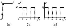 18、某空间存在着一个变化的电场和一个变化的磁场,电场方向向右[如下图(a)中由B到C的方向],电场变化如图(b)中E-t图象,磁感应强度变化如图(c)中B-t图象.在A点,从t=1 s(即1 s)开始,每隔2 s,有一个相同的带电粒子(重力不计)沿AB方向(垂直于BC)以速度v射出,恰能击中C点,若