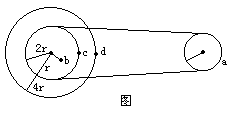 图所示为一皮带传动装置,右轮的半径为r,a是它边缘上的一点,左侧是一轮轴,大轮的半径是4r,小轮的半径为2r。b点在小轮上,到小轮中心的距离为r。c点和d点分别位于小轮和大轮的边缘上。若在传动过程中,皮带不打滑。则