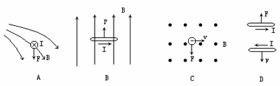34.在图中,各图已标明电流(或运动电荷速度)、磁感强度B、和安培力(或洛仑兹力)这三个物理量的方向,其中正确的是 :