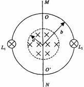 18.(13分)半径为a的圆形区域内有均匀磁场,磁感强度为B=0.2T,磁场方向垂直纸面向里,半径为b的金属圆环与磁场同心地放置,磁场与环面垂直,其中a=0.4m,b=0.6m,金属环上分别接有灯L1、L2,两灯的电阻均为R0=2Ω,一金属棒MN与金属环接触良好,棒与环的电阻均忽略不计