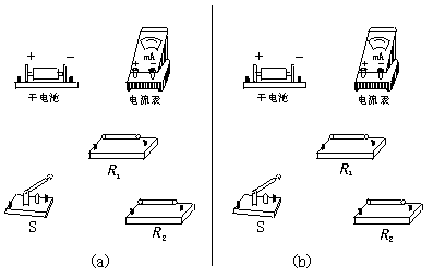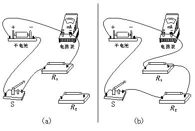 mA,已超过电流表的量程.因此,考虑到实验的可行性,若第一个回路中的定值电阻单独用R1,如图(a)所示,第二个回路中的定值电阻只能改用R1与R2串联成的电阻,如图(b)所示,这便得到解答中的两个实物连线电路图.只要把式①中的R用实验中的R1表示,测得的电流用I1表示;式②中的R2用R1+R2表示,测得的电流用I2表示,式③就变成E=![]()