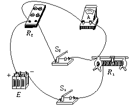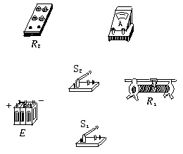 7.(2002年广东,12)现有器材:量程为10.0 mA、内阻约30~40 Ω的电流表一只,定值电阻R1=150 Ω,定值电阻R2=100 Ω,单刀单掷开关S,导线若干,要求利用这些器材测量一干电池(电动势约1.5 V)的电动势.