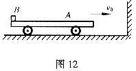 (10分)如图12所示,小车A和小木块B(B可看成是质点)的质量分别是MA=15.0kg, mB=5.0kg,车的长度L=4.0m。B位于A的最左端,与A一起以u0=4.0m/s的速度沿水平地面向右做匀速运动。右面有一固定的竖直墙壁,A与墙壁相碰的时间极短,碰后A以原速率向左运动。由于A、B之间有摩擦力,最后B恰停在A的最右端而没有掉下去。取g=10m/s2。求: