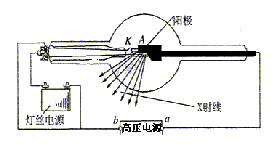 10、如图是产生X射线的装置,叫做X射线管,图中的K是阴极,A是阳极,通电时,由阴极发出的电子,打在阳极上,从阳极上激发出X射线(也称X光),设其中光子能量的最大值等于电子到达阳极时的动能,已知阴极与阳极之间电势差U、普朗克常量h电子电荷量e和光c,则(设电子初