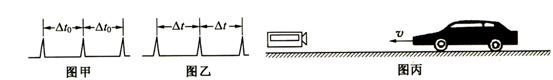 12、交管局规定,“2002年1月1日开始在高速公路上行驶的大客车、大货车行驶速度不得超过90km/h。小轿车行驶速度不得超过110km/h。”这项条例的实现依赖于对车速及时、准确的测定,现假定用超声波测速仪测量车速,测量原理是:超声波测速仪每隔一相等时间Δt0,发出一超声脉冲信号(如图甲所示),每隔一段时间Δt接收到一经汽车反射回的该超声脉冲信号,若汽车匀速行驶,则间隔时间Δt相同(如图乙所示),根据发出和接收到的信号间的时间间隔差和声速,测出被测汽车的速度。