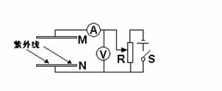 14、如图所示是测定光电效应产生的光电子荷质比的简要实验原理图。两块平行板相距为d,其中N为金属板,受紫外线照射后将发射出沿不同方向运动的光电子形成电流,从而引起电流计指针偏转。若调节R逐渐增大板间电压,可以发现电流逐渐减小,当电压表示数为U是,电流恰好为零,切断开关,在MN间加上垂直与纸面的匀强磁场,逐渐增大磁感应强度,也能使电流为零。当磁感应强度为B时,电流恰好为零。求光电子的荷质比e/m。