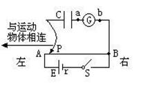 15、传感器应用的一个基本思想是“转换”的思想,即利用传感器把难以直接测量的力学量转换为容易测量的电学量。这种转换既使测量比较方便,而且能输入给电子计算机对电学量所载的信息进行计算和处理。如图所示为一测速计原理图,其基本原理即是把测量速度这一力学量转换成电流量进行测量。滑动触头P与某运动物体相连,当P匀速滑动时,电流表有一定的电流通过,从电流表示数可得运动物体速度。已知电源电动势E=4V内阻r=10Ω,AB为粗细均匀的电阻丝,其阻值为R=30Ω、长度L=30cm,电容器的电容C=50μF。今测得电流表示数为0。05mA,方向由b流向a。试求运动物体的速度大小和运动的方向。