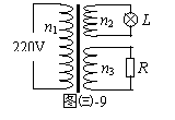 11.如图㈢-9,理想变压器初级线圈和两个次级线圈的匝数分别为n1=1760匝、n2=288匝和n3=8000匝,电源电压为U1=220V。n2上连接的灯泡的实际功率为36W,测得初级线圈的电流为I1=0.3A,求通过n3的负载R的电流I3。