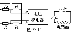 17.如图㈢-14所示,是在环境温度为10℃左右的条件下工作的某自动恒温箱原理简图。箱内电阻R1=20kΩ,R2=10kΩ,R3=40kΩ,R4为热敏电阻,其阻值随温度变化的图线如图㈢-15所示。当电压鉴别器两接入点a、b的电势φa<φb时,鉴别器将自动使电键K接通,使恒温箱内的电热丝发热,从而使箱内温度升高;当φa >φb时,鉴别器将使K断开,停止加热。求:⑴根据以上说明,判定该恒温箱内的温度将保持在多少摄氏度?⑵若想使恒温箱内的温度保持在30℃,在保持R1 、R2不变的情况下,应该把R3更换成阻值多大的定值电阻?