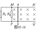 如图㈢-16,MN、PQ是两条水平放置的平行光滑导轨,其电阻可以忽略不计,导轨间距离l=0.60m。垂直于导轨平面向里的匀强磁场的磁感应强度B=0.40T。金属杆ab垂直于导轨放置,与导轨接触良好,ab杆在导轨间部分的电阻r=1.0Ω。在导轨的左端连接有电阻R1、R2,阻值分别为R1=3.0Ω和R2=6.0Ω。ab杆在水平拉力F作用下以v=5.0m/s的速度向右匀速运动。求:⑴通过ab杆的电流I ⑵拉力F的功率PF ⑶电阻R1上每分钟产生的电热Q1