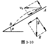 (2)将v0和重力加速度g,沿平行于斜面的方向和垂直于斜面的方向分解(如图3-10);则小球的平抛运动,可以看作是平行于斜面方向上初速度为v0cosθ、加速度为gsinθ的匀加速运动,与垂直于斜面方向上初速度为v0sinθ、加速度为