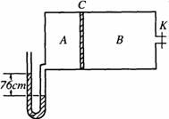 室温为T0=300K有一光滑导热活塞 C(不占体积)将容器分成A、B两室,B室的体积是A室的两倍,A室容器上连接有一U形管(U形管内气体的体积忽略不计),两边水银柱高度差为76cm,右室容器中连接有一阀门K,可与大气相通。(外界大气压等于76cm汞柱)求: