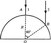 17.(12分)半径为R的透明介质半圆柱体,横截面如图所示,圆心为O。两条平行单色红光平行于截面且与底面垂直射向圆柱面,光线1的入射点A为圆柱面的顶点,光线2的入射点为B,∠AOB=60°。已知介质对红光的折射率