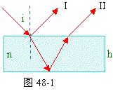 如图48-1所示,折射率为n的玻璃砖的两面是平行的,玻璃砖厚度为h,一束细光束射到玻璃砖上表面的入射角为i,光线一部分从上表面反射回空气中;另一部分折射入玻璃砖,在玻璃砖下表面发生反射,又在上表面折射后射入空气中。求:上表面的反射光线I与下表面反射,折射回到空气的光线II的侧移距离为多少?