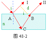 分析与解:光路图如图48-2所示。光线射到A点,反射光线为I,折射光线射到下表面C点再反射到上表面B点,形成折射光线II。