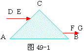 如图49-1所示,三角形ABC为一等腰直角三棱镜的主截面。令一单色光线DE平行于AB面从空气中自AC面射入,经AB面反射后从BC面射出,FG为出射光线,光线DE、FG的走向均可用插针法实验确定出来。(1)试用几何作图法在图中画出在棱镜内的光路走向,(2)证明:射到AB面上的光线一定发生全反射。