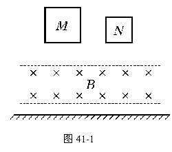 用长度相同,横截面积之比为2∶1的均匀铜导线制成的两个正方形线框M和N,使它们从同一高度自由下落,途中经过一个有边界的匀强磁场区域,磁场方向垂直纸面向里,如图41-1所示.若下落过程中线框平面始终与磁场方向保持垂直,不计空气阻力,则M、N底边进入磁场瞬间的速度vM∶vN= ,加速度aM∶aN= ,在穿过磁场的过程中,线框M、N内产生的热量QM∶QN= .