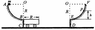 的1/4光滑圆弧轨道 AB 的最高点 A 处由静止滑下。质量也为 m,上表面长为 R 的小车静止在光滑水平面 CD 上。小车表面分别与半径为 R 的1/4光滑固定圆弧轨道 AB、EF 的末端 B 和 E 的切线在同一水平面内,物体从轨道末端 B 滑上小车,小车即向右运动。当小车右端与壁 DE 刚接触时,物体 m 恰好滑到小车右端且相对于小车静止,同时小车与 DE 相碰后立即停止运动,物体则继续滑上光滑的圆弧轨道 EF,以后又滑下来冲上小车。试求:
