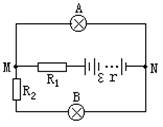 为0.2Ω,R2=2Ω,灯A的标号为“6V,6W”,灯B是“4V,4W”,求: ①如果要使B灯正常发光,R1应是多大? ②这时灯A的实际功率是多少? |