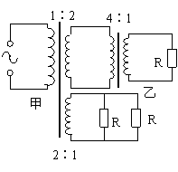 9、甲、乙两个理想变压器,它们的原副线圈的匝数比以及连接方式如图9所示,若输电线的电阻略去不计,甲输入电压是220V,负载中每个电阻均为11Ω,则甲的输入电流和输入功率分别是: