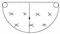 12.铜盘的半径为r,竖直悬挂,可绕O点无摩擦地滑动,匀强磁场B垂直于圆盘,盘边缘绕着细长线,线一端挂着质量为m的物体,电阻R与电源ε按图示方法接到圆盘上,现欲使重物以速度v匀速提升,问所用电源电动势为多少?(设圆盘的质量不计,电阻不计,导线与圆盘连接良好)。