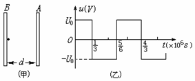如图17(甲)所示,A、B是在真空中平行放置的金属板,加上电压后,它们之间的电场可视为匀强电场。A、B两极板间距离d=15cm。今在A、B两极板上加如图17(乙)所示的交变电压,交变电压的周期T=1×10-6s;t=0时,A板电势比B板电势高,电势差U0=1080V。一个荷质比q/m=1×108C/kg的带负电的粒子在t=0时从B板附近由静止开始运动,不计重力。问: