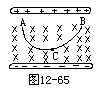 7.设空间存在竖直向下的匀强电场和垂直纸面向里的匀强磁场,如图12-65所示,已知一离子在电场力和洛仑兹力的作用下,从静止开始自A点沿曲线ACB运动,到达B点时速度为零,C点是运动的最低点,忽略重力,以下说法中正确的是 [ ]