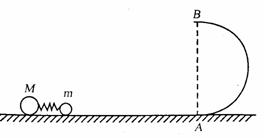 16、(12分)在光滑的水平桌面上有质量分别为M=0.6kg,m=0.2kg的两个小球,中间夹着一个被压缩的具有Ep=10.8J弹性势能的轻弹簧(弹簧与两球不相连),原来处于静止状态,突然释放弹簧,球m脱离弹簧后滑向与水平面相切,半径为R=0.425m的竖直放置的光滑半圆形轨道,如图所示,g取10m/s2,求![]()