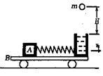 20 如图示,光滑水平面上有一小车B,右端固定一砂箱,砂箱左侧放有一水平轻弹簧,小车和砂箱的总质量为M,车上放着一物体A,质量也为M,物体A随小车以速度v0 向右匀速运动,物体A与左侧的车面间有摩擦,摩擦因数为μ;与其它车面间无摩擦,在匀速运动时,距砂面H高处有一质量为m的泥球自由下落,恰好落在砂箱中。求: