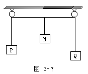2.如图3-7所示,质量均为m的钩码P和Q用足够长的绳子相连,挂在两高度相同的光滑的圆环上,处于静止状态,在两环中点处再挂一质量为m的钩码N,放手后 [ ]