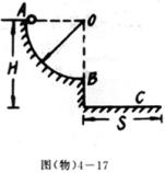 (12分)如图所示4-17所示,位于坚直平面上的1/4圆弧光滑轨道半径为R,OB沿竖直方向,上端A距地面高度为H,质量为m的小球从A点由静止释放,最后落在地面上C点处,不计空气阻力。求;
