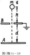 (13分)如图4-19,A、B两水平平行金属板构成一个电容为C的电容器,其B板接地且最初A、B均不带电,今在B板上方h处有一带电量为q,质量为m的小液珠从静止开始时对准B板上的小孔落下,若能落到A板上A、B间距离为d,不计空气阻力。问: