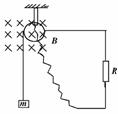 11.如图所示,半径为r的铜质滑轮上,绕有很长的细绳,绳子的末端拴有一质量为m的重物,匀强磁场方向垂直于滑轮,磁感应强度为B.一个电阻阻值为R,其一端与滑轮轴相连,另一端通过滑片与滑轮边缘良好接触.现释放重物,使滑轮开始转动,不计摩擦,那么下列说法正确的是( )