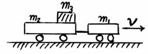 14.如图所示,在光滑的水平面上,有一质量为m1 =20千克的小车,通过几乎不可伸长的轻绳与质量m2 =25千克的足够长的拖车连接。质量为m3 =15千克的物体在拖车的长平板上,与平板间的摩擦系数m=0.2,开始时,物体和拖车静止,绳未拉紧,小车以3米/秒的速度向前运动。求: