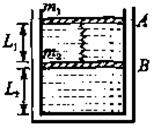 26.如图所示,在直立的气缸内有上、下两个气缸活塞A和B质量相等。连接两活塞的轻质弹簧的劲度系数K=50N/m,活塞A上方气体的压强P=100 Pa。平衡时两活塞之间的气体的压强也为P=100Pa,气体的厚度l1=0.20m。活塞B下方的气体的厚度l2=0.24m。气缸口的截面积S=0.10m2,起初气缸内气体的温度是T=300K,现让气体的温度缓慢上升,直到温度都达到T’=500K,试问在此过程中,活塞A向上移动了多少距离?
