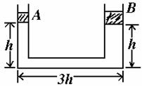 28.两端开口,内表面光滑的U形管处于竖直平面内,质量均为m=10kg的活塞A、B,在外力作用下静止于左、右两管中的同一高度h处,将管内空气密封,此时管内外空气的压强均为P0=1.0×105Pa,左管和水平管的横截面积S1=10cm2,右管的横截面积S2=20cm2,水平管的长度为3h,如图所示,现撤去外力,让活塞在管中下降,求两活塞稳定后的高度。(活塞的厚度略大于水平管的直径,管内温度不变,g=10m/s2)