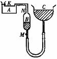 30.如图所示是一个容积计,它是测量易溶于水的粉末状物质的实际体积的装置。A容器的容积VA=300cm3.K是通大气的阀门。C是水银槽,通过橡皮管与容器B相通,连通A、B的管道很细,容积可以忽略,下面是测量操作过程;(1)打开K,移动C,使B中水银面降低到与标记M相平;(2)关闭K,缓慢提升C,使B中水银面升到与标记N相平,量出C中水银面比标记N高h1=25cm;(3)打开K,将待测粉末装入容器A中,移动C使B内水银面降到M标记处。(4)关闭K,提升C使B内水银面升到与N标记相平,量出C中水银面比标记N高h2=75cm.(5)从气压计上读得当时大气压为P0=75cmHg.设整个过程温度保持不变,试根据以上数据求出A中待测粉末的实际体积。
