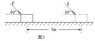 13.在光滑水平面上,一个人用100N的力与水平方向成60º角推-个箱子前进6m,如图3所示,则推力所做的功是