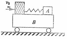 19.(14分)如下图所示,光滑水平面上有一静止小车B,左端固定一砂箱,砂箱的右端连接一水平轻弹簧,小车与砂箱的总质量为M1=1.99kg,车上静置一物体A,质量为M2=2kg。此时弹簧呈自然长度,物体A的左端车面是光滑的,而物体右端车面与物体间的动摩擦因数为μ=0.2。现有一质量为m=0.01kg的子弹以水平速度v0=400m/s打入砂箱且立即静止在砂箱中,求:
