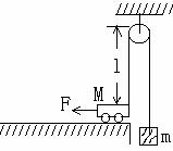 ⒙ (12分)如图所示,质量M=2.0kg的小车,置于光滑水平面上,另一质量m=1.0kg的物块通过一柔软的细绳与小车连接在一起,细绳跨过光滑的定滑轮,开始时两者都静止,定滑轮两侧的绳子都处在竖直方向上,左侧绳子长l=1.5m,右侧绳子足够长。现对小车施加水平力F,使小车由静止开始向左匀加速运动,加速度a=0.25m/s2,当小车的位移s=2.0m时,求水平力F在整个过程中对小车做的功?