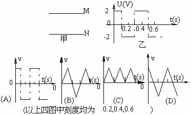 如甲图所示: 变化规律如图中乙图所示的交变电压加在平行板电容器的MN两板上,开始时N板的电势比M板高,这时有一个原来静止的负离子正处在两板的中间,负离子在电场作用下开始运动。设M、N两板间距离足够大。图所示四个图是离子运动的v-t图线,其中正确的是( )