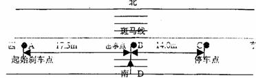 16.(16分)在某市区内,一辆小汽车在平直的公路上以速度VA向东匀速行驶,一位观光旅客正由南北从斑马线上横过马路,汽车司机发现前方有危险(旅客正在D处),经0.7s作出反应,紧急刹车,但仍将正步行到B处的游客撞伤,该汽车最终在C处停下,为了清晰了解事故现场,现以图示之: