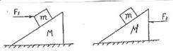 20.质量为M的斜面体置于水平面上,其上有质量的为m的物体,各面之间均为光滑。第一次将水平力F1加在m上,第二次将水平力F2加在M上,如图所示。两次都要求m,M间不发生滑动。求F1/F2。
