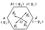 如图所示,在正六边形的a、c两个顶点上各放一带正电的点电荷,电量的大小都是q1,在b、d两个顶点上,各放一带负电的点电荷,电量的大小都是q2,q1 >q2,已知六边形中心O点处的场强可用图中的四条有向线段中的一条来表示,它是哪一条?