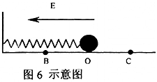 如图6所示,一个由绝缘材料制成的轻弹簧水平放置,一端固定于竖直墙上,另一端与一带负电的小球相连,小球置于光滑的绝缘水平面上。当整个装置处于水平向左的匀强电场中时,振子在O点处于平衡状态,在B、C两点间振动。假定在振动过程中小球的电量保持不变,则 ( )