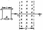 图中abcd为一边长为l、具有质量的刚性导线框,位于水平面内,ac边中串接有电阻R,导线的电阻不计.虚线表示一匀强磁场区域的边界,它与线框的ab边平行,磁场区域的宽度为2l,磁感强度为B,方向竖直向下.线框在一垂直于ab边的水平恒定拉力作用下,沿光滑水平面运动,直到通过磁场区域.已知ab边刚进入磁场时,线框便变为匀速运动,此时通过电阻R的电流的大小为i0,试在图的i-x坐标上定性画出:从导线框刚进入磁场到完全离开磁场的过程中,流过电阻R的电流i的大小随ab边的位置x变化的曲线。