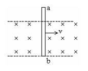 2. 如图所示,有导线ab长0.2m,在磁感应强度为0.8T的匀强磁场中,以3m/S的速度做切割磁感线运动,导线垂直磁感线,运动方向跟磁感线及直导线均垂直.磁场的有界宽度L=0.15m,则导线中的感应电动势大小为 [ ]