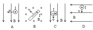 4. 图中的四个图分别表示匀强磁场的磁感应强度B、闭合电路中一部分直导线的运动速度v和电路中产生的感应电流I的相互关系,其中正确是 [ ]