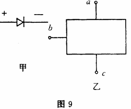 二极管是电子线路中重要的元件之一,它的符号如图9甲所示。当二极管“+”极电势比“-”极高时,电路处于导通状态(可认为电阻是零),当二极管的“+”极电势比“-”极低时,二极管处于截止状态(可视为电阻无穷大)。现有一黑箱,其内部电路由一只10Ω的定值电阻和一只二极管构成,该电路接到黑箱外有三个接线柱a、b、c。当用多用电表的欧姆档测a、b间电阻时,无论红表笔接a还是接b,电阻均为10Ω;当红表笔接b,黑表笔接c时,电阻为无穷大;当红表笔接c,黑表笔接b时,电阻为10Ω,试在图9乙黑箱内画出其电路。