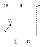 24、如图17所示为一匀强电场的部分等势面,等势面都竖直,相邻两等势面相距0.50cm,一个质量为5.0g的带电液滴以1.25m/s的速度V0飞入电场,方向斜向上与等势面成37°角。若液滴进入电场能沿直线运动,电量不损失。问: